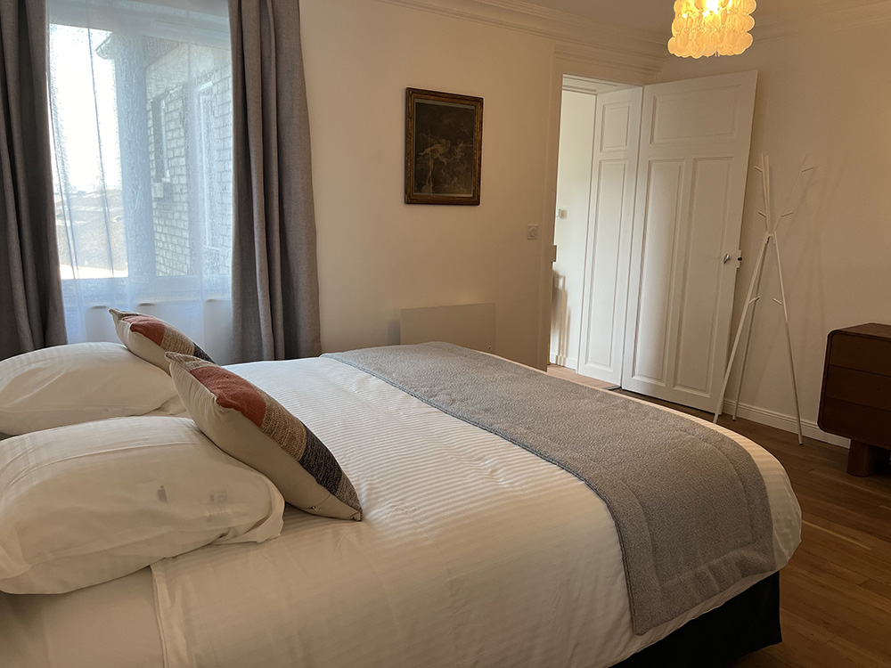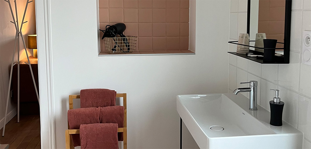 Accessible par une entrée privée, il se compose d’une chambre équipée d’un très grand lit double, reconnu pour son excellent confort (noté 9/10 par les voyageurs). L’espace comprend également un coin salon chaleureux, idéal pour se détendre après une journée de visites, de travail ou de découverte de la Champagne.